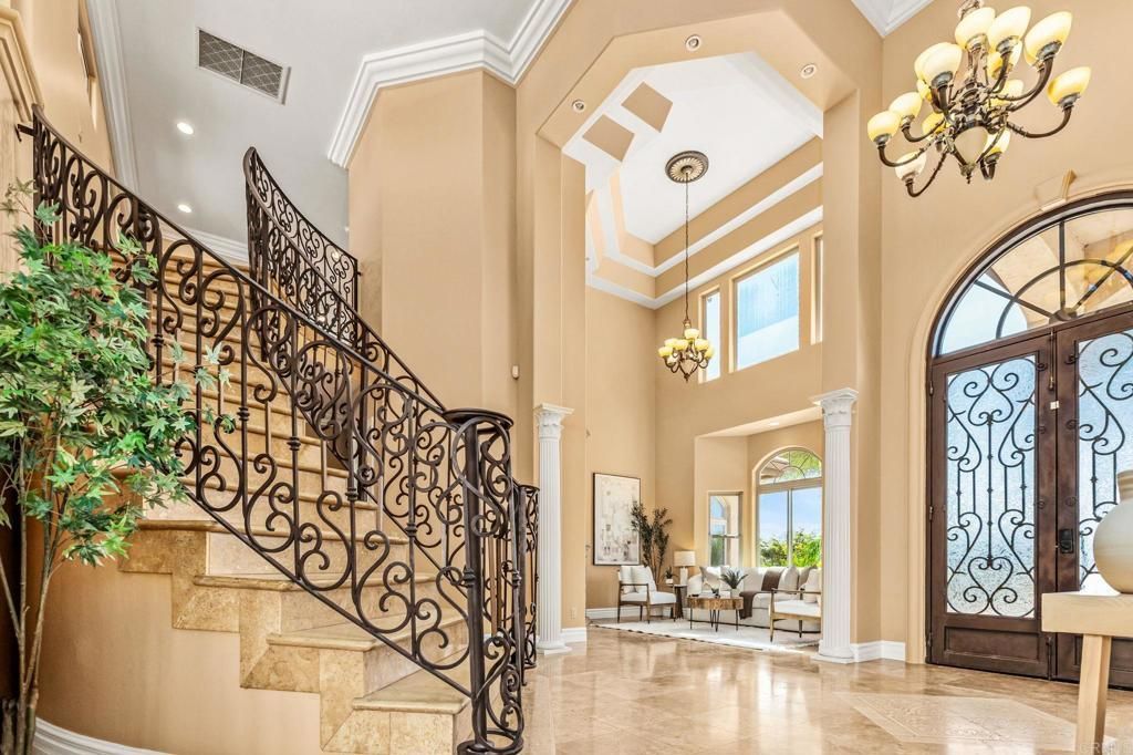 Located in Proctor Valleys most desirable neighborhood, this gated estate offers a rare opportunity to experience elevated living on a beautifully positioned corner parcel just over an acre. Surrounded by sweeping mountain vistas and open skies, the setting captures the essence of Jamul living while remaining just 10 minutes from Rancho San Diego and an easy 20-mile drive to Downtown San Diego. A grand arrival begins with impressive architectural presence and elegant wrought iron entry doors, opening to interiors defined by soaring ceilings, natural light, and timeless finishes. Rich travertine floors run throughout the main living areas, complementing the statement staircase and refined spaces that create an inviting yet sophisticated atmosphere. The formal living room is anchored by a custom precast concrete fireplace, while the formal dining area is framed by large windows that bring the outdoors in. Designed for both everyday comfort and entertaining, the open-concept layout seamlessly connects the main living areas. The kitchen is thoughtfully appointed with granite countertops, custom cabinetry, a walk-in pantry, and high-end appliances, flowing effortlessly into the family room and casual dining nook. The main-level primary suite offers a private retreat with tranquil views, a spacious walk-in closet, and a spa-inspired bath featuring a soaking tub and oversized shower. An additional bedroom on the first floor provides flexibility for guests or multigenerational living, while upstairs bedrooms share a full bath and include a dedicated workspace. Outdoors, the property transforms into a resort-style sanctuary. A custom rock pool with waterfall, slide, and raised spa is complemented by an outdoor kitchen, BBQ area, and expansive patio spaces designed for gathering and relaxation. Mature landscaping, including fifteen fruit and citrus trees, enhances the grounds, while a basketball court and open space offer flexibility for animals or a detached ADU. Additional features include owned solar, Tesla charger, a three-car garage, extended driveway, and full fencing for privacy and security. With no HOA, proximity to local wineries and golf, and a peaceful setting framed by natural beauty, this home delivers a lifestyle that feels both refined and effortless.