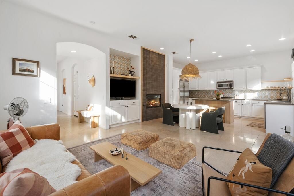 European-style move-in ready home in the coveted gated Pintura community with stunning San Jacinto mountain views located in the historic Araby Cove area of South Palm Springs. Professionally renovated by Flair Design and Build, Inc. in 2025 with architecture details inspired by the Balearic Islands, this two-level residence blends rustic elegance and low-maintenance living. The main level showcases a dramatic carbon-tiled wall gas-log fireplace, a custom media cabinet with a natural oak shelf, Italian travertine flooring, and a sophisticated kitchen appointed with taupe Caesarstone slab countertops, Spanish tile backsplash, natural floating shelves, stainless steel appliances, and a premium Sub-Zero refrigerator. The open layout creates an inviting flow for both everyday living and entertaining. Upstairs, the home features dual oversized primary suites, each with walk-in closets, and solar shades providing comfort and privacy. The main primary suite, office/loft area, and private balcony all capture breathtaking mountain views! Bathrooms upgraded with travertine flooring, showers, countertops, and custom oak-framed mirrors. Additional highlights include an attached oversized high-ceiling two-car garage with epoxy flooring. Residents of Pintura enjoy a charming Tuscan village ambiance with cobblestone streets in a secure gated setting at a low HOA, just minutes from downtown Palm Springs, PSP, renowned hiking trails, Koffi, and an array of popular neighborhood restaurants and cafes. This home is sold fully designer-furnished for a seamless, turnkey experience.