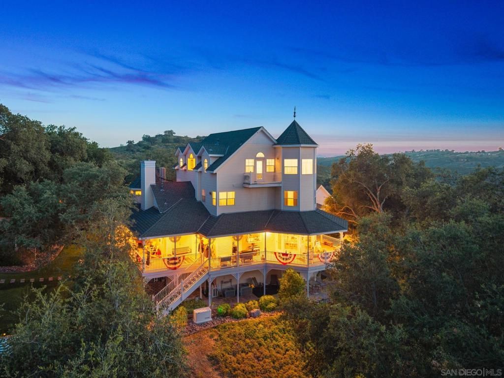 A rare Victorian estate offering comfort, luxury, & a lifestyle all its own. Set on 8.55 open & spacious acres, dotted with mature oaks, this home blends classic charm w/ modern updates. Designed for those who value creativity, privacy, and flexible living, this residence is defined by its intentional separation of spaces?creating distinct areas for living, working, entertaining, and retreating.Soaring ceilings, intricate details, & expansive living areas create a grand yet inviting feel. 2BD 1BA detached guest suite. Designed and built by a renowned architect as his personal residence, this one-of-a-kind Victorian estate blends the timeless charm of New England architecture with inspiration from the iconic Hotel del Coronado. Featured on the cover of the Ramona Home Journal and showcased on the Ramona Home Tour, its a true standout. A rare opportunity to own a truly distinctive, architect-designed residence offering 4,985 square feet of thoughtfully separated living and work spaces within a private community of custom estates, all sitting on a minimum of 8 acre lots to ensure even more privacy. This home sits on 8.55 open and spacious acres, dotted with mature oaks. Designed for those who value creativity, privacy, and flexible living, this residence is defined by its intentional separation of spaces?creating distinct areas for living, working, entertaining, and retreating. The main living area serves as the heart of the home, featuring a spacious kitchen with breakfast nook, formal dining room with two sided fireplace, and a private den or reading space with a cozy fireplace. A dedicated bedroom level offers two generously sized suites, each with its own en suite bath, and a conveniently located laundry room creating a comfortable and private personal retreat. A light-filled upper retreat provides a versatile space ideal as a creative studio, executive office, or wellness area, with the potential for an extra-large primary retreat with a future bathroom (plumbing accessible below), allowing for added customization. The lower level is designed for entertainment and hosting, featuring a game room, bar area, media space, full bath, and flexible guest accommodations?ideal for extended stays or private use. A separate 1,104 sf structure with fireplace, full bathroom, wide open office space, and kitchenette, connects via breezeway off the wrap around porch and away from the main home, offers an exceptional opportunity for a dedicated workspace, studio, fitness area, client-facing office, or out of town guests?perfect for todays live/work lifestyle. Set within an HOA that maintains the integrity and quality of the community, this home is best suited for those seeking a primary residence or a dynamic live/work environment (short-term rentals not permitted). This is not a conventional home?it is a property designed around lifestyle flexibility, privacy, and purposeful living. For the right buyer, it offers a rare opportunity to live, c