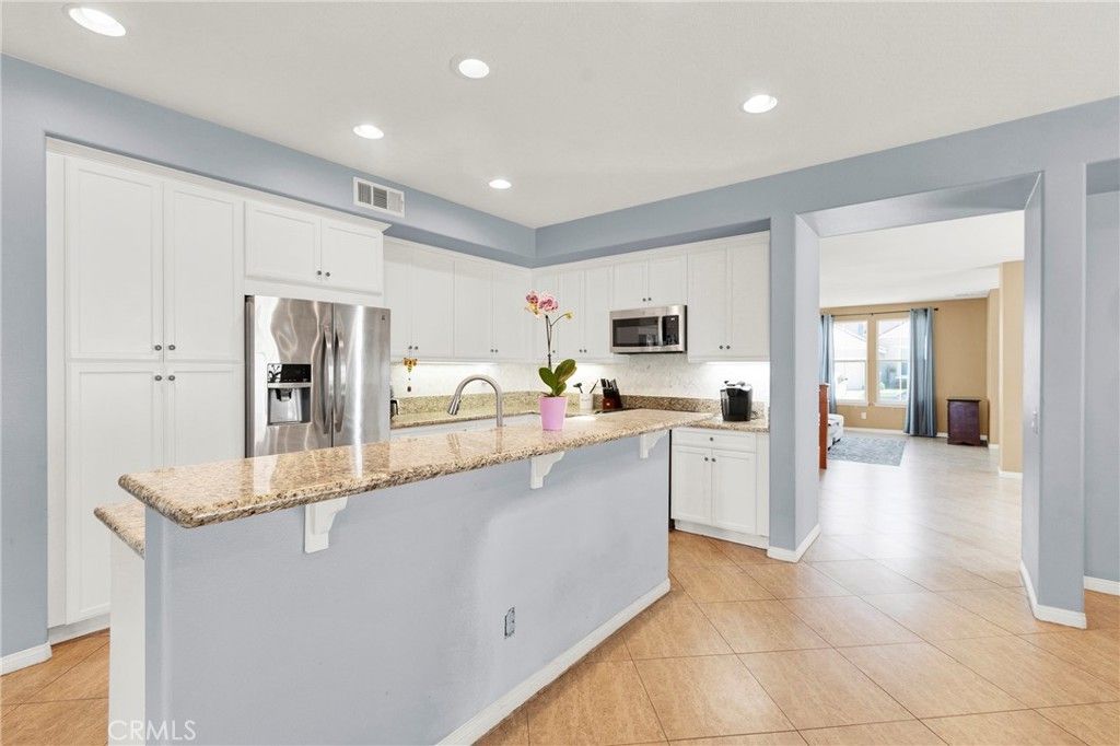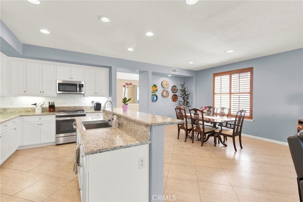 VIEW of neighborhood, hills and mountains in Clayton Ranch community. This turn-key 4-bedroom, 3-bathroom home is a well-designed living space, for entertaining, home office, or multigenerational living. The main level features soaring ceilings, tile flooring, plantations shutters, and an abundance of natural light. There is a formal living and dining area, along with a large family room with cozy fireplace. The open-concept updated kitchen includes a center island and plenty of cabinetry with pull-out shelves. This home has a popular MAIN floor bedroom and a bath. Upstairs is BRAND new carpet, two bedroom and a primary suite with a spacious sitting and spa jetted tub. This large suite includes his-and-her walk-in closets along with separate linen closet along with a large sized upstairs laundry room featuring cabinet storage. The backyard offers a sense of privacy with a newer covered patio, and no direct rear neighbors at eye level. Enjoy mature trees in both front and back yards. Located in a desirable HOA community, this home is just minutes from shopping, new hospitals and both the 15 and 215 freeways. Don't miss this desirable home in conveniently located Wildomar.