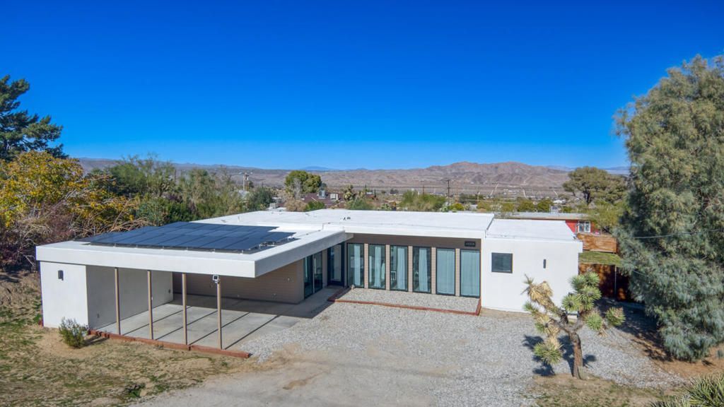 Modern 2021-built home with floor-to-ceiling German-imported Arka windows, paid-off premium solar, and stunning mountain & desert views from every room. This contemporary retreat blends high-end design with exceptional comfort, offering a bright, open layout and top-tier finishes throughout. Perfect as a full-time residence, desert getaway, or turnkey short-term rental--with the option to assume the existing successful Airbnb listing and furnishings (additional price). Inside, enjoy a beautiful modern kitchen featuring quartz countertops, tiled backsplash, sleek cabinetry with soft-close drawers, open shelving, and a large wine fridge. The spacious living area includes an electric fireplace/heater, built-in Sonos ceiling speakers, dimmable lighting, and seamless indoor-outdoor flow. All four bedrooms are generously sized, and three feature en suite bathrooms, ideal for privacy and guest comfort. Barn doors on closets, keyless entry, and a tankless water heater add both style and convenience. Go outside to the expansive nearly 1/2-acre lot with a 15' x 8' propane-heated 4-ft deep pool (dedicated propane tank & autofill), large concrete patio with grill, and wide-open desert skies. Additional highlights include a 2-car carport, large finished storage room, an EV charging port (NEMA 14-30 & 14-50 capacity), very efficient 6 mini split/3 condenser heating and AC system, low-voltage speaker wiring, virtually no electric bills, WiFi connection, and new washer/dryer. Located just 10 minutes to Joshua Tree National Park, 5 minutes to Downtown Joshua Tree, and a 3-minute walk to the Friendly Hills hiking trail, home to occasional Mojave Tortoise sightings. With high-end construction and a proven rental history this property is an exceptional opportunity in one of the desert's most desirable locations.